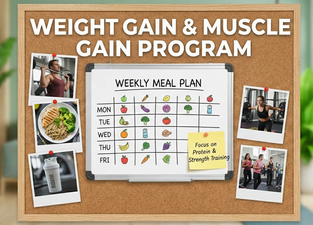 Gaining weight or muscle isn’t about eating junk food or overloading on supplements. It’s about balanced nutrition, proper training support, and a plan designed for your body. Our Weight Gain & Muscle Gain Program focuses on helping you gain lean mass, strength, and overall health in a safe and sustainable way.